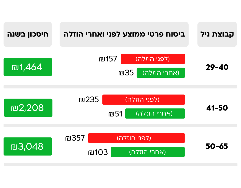 כמו שאתם יכולים לראות בטבלה, המבוססת על נתונים מדויקים ורשמיים שאספנו, ההוזלה משמעותית מאוד. גובה ההוזלה משתנה בהתאם לגילו של המבוטח, עלות הביטוח הנוכחית שלו, סוגיות רפואיות קיימות – ועוד.
